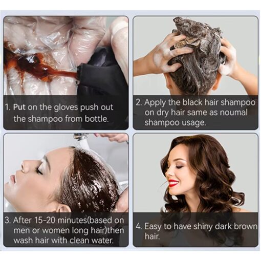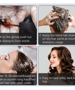 - Fácil de usar y consejos: prueba la piel antes del primer uso; 1. Aplica los guantes, aplica nuestro champú de color de pelo sobre el cabello seco. 2. Frota uniformemente durante 5 minutos; 3. Déjalo durante 10-15 minutos (si tu cabello es largo, 20-25 minutos para obtener los mejores resultados, de lo contrario no cubrirá completamente el cabello gris. No dejes más de 30 mins). 4. luego enjuague. Puedes tener un cabello negro brillante natural al instante.