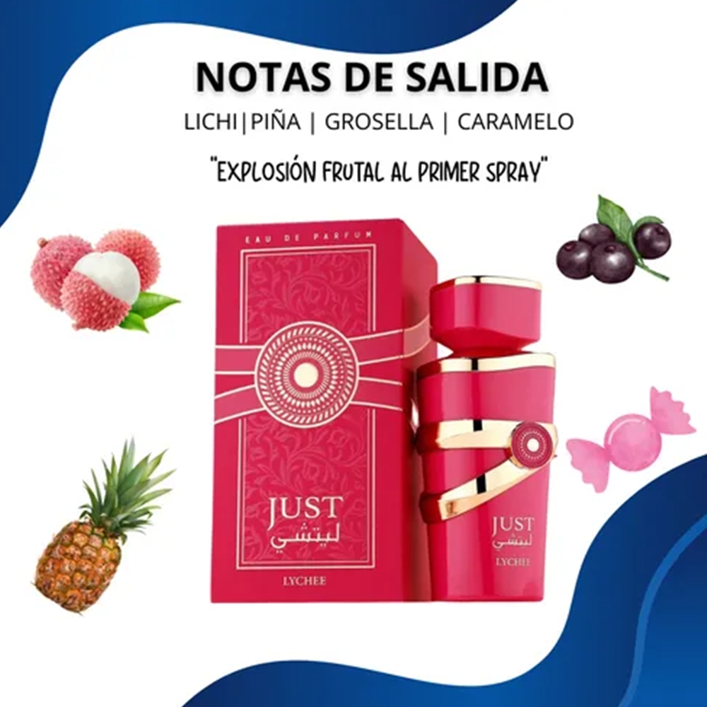 Este equilibrio convierte a Just Lychee en un perfume versátil, femenino y encantador, con una apertura refrescante, un corazón romántico y un fondo sensual que lo hace inolvidable.